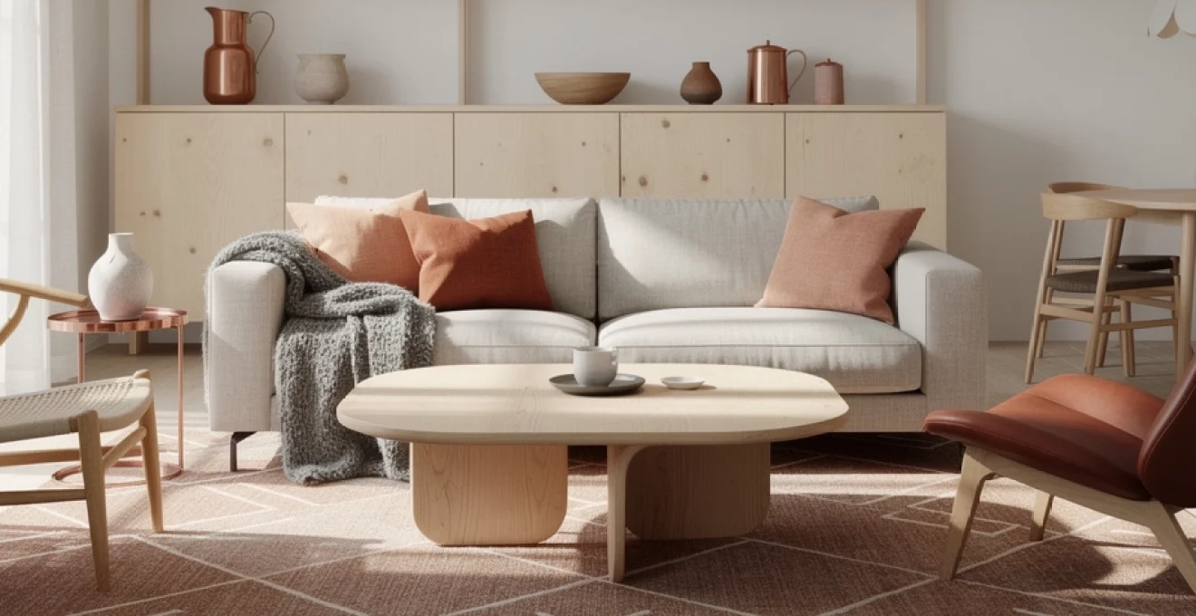 La palette de couleurs du scandicraft s’inspire directement des paysages nordiques, mais s’enrichit de nuances plus chaudes et terreuses que le scandinave classique. La base reste constituée de blancs cassés, de beiges sable et de gris très clairs, indispensables pour refléter la lumière et agrandir visuellement les espaces. À cette toile de fond lumineuse viennent s’ajouter des tonalités de terre de Sienne, terracotta, ocre et brun tabac, qui réchauffent l’ensemble et lui donnent une profondeur nouvelle.
